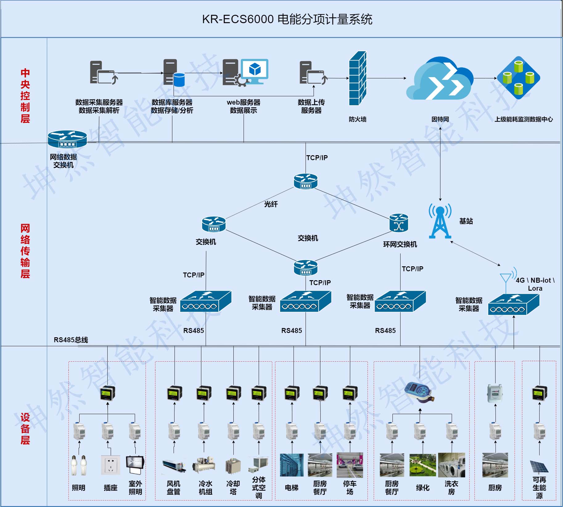 kr-ecs6000電能分項計量能效監(jiān)測平臺是通過對建筑安裝分項能耗計量裝置,采用遠程傳輸?shù)仁侄渭皶r采集能耗數(shù)據(jù),實現(xiàn)重點建筑能耗在線監(jiān)測和動態(tài)分析的硬件系統(tǒng)和軟件系統(tǒng)的統(tǒng)稱。分項能耗是指根據(jù)建筑消耗的電能、水、燃氣等按照主要用途進行劃分,如電能劃分為:空調(diào)用電、動力用電、照明用電、特殊用電等。